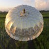 Prachtige parasol uit Bali. De Balinese parasol is geheel handgemaakt. Het doek van de parasol is gemaakt van een luxe stof met geweven bloemen erin verwerkt. De parasol is afgewerkt met franjes en schelpen. De stok en de top van de parasol is decoratief versierd met houtsnijwerk.